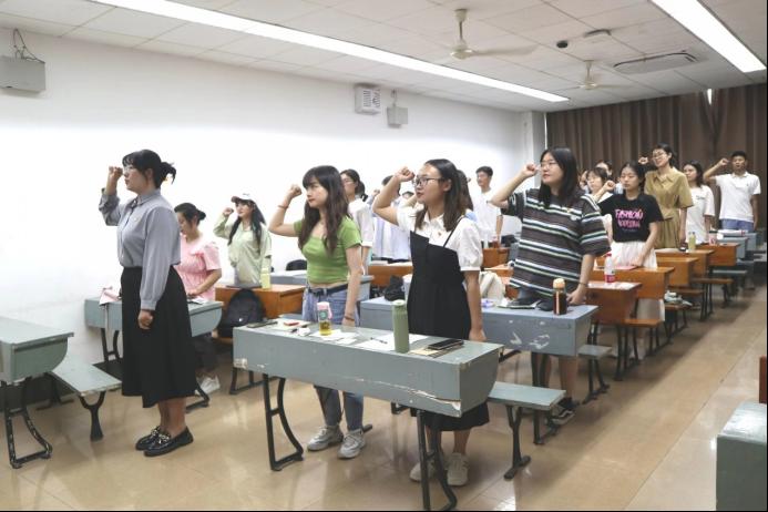 最后与会党员全体起立,面向党旗,重温入党誓词。