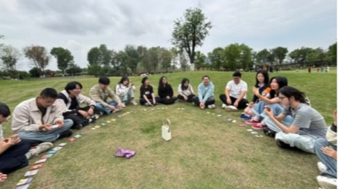 同心理研究与咨询中心联合举办“心灵共振·音愈同行”草地音乐会团辅活动,2024级硕士班学生积极参与。活动以“声音冥想”开场,同学在引导下聆听颂钵与吉他协奏放松身心,在音乐疗愈中感受学科交融;以“桃花朵朵开”和“大风吹”等互动游戏打破专业界限; “心理欧卡”环节,王同学以“沙漠绿洲”卡牌结合唯物辩证法分析,引发对理论与实践结合的深入思考。