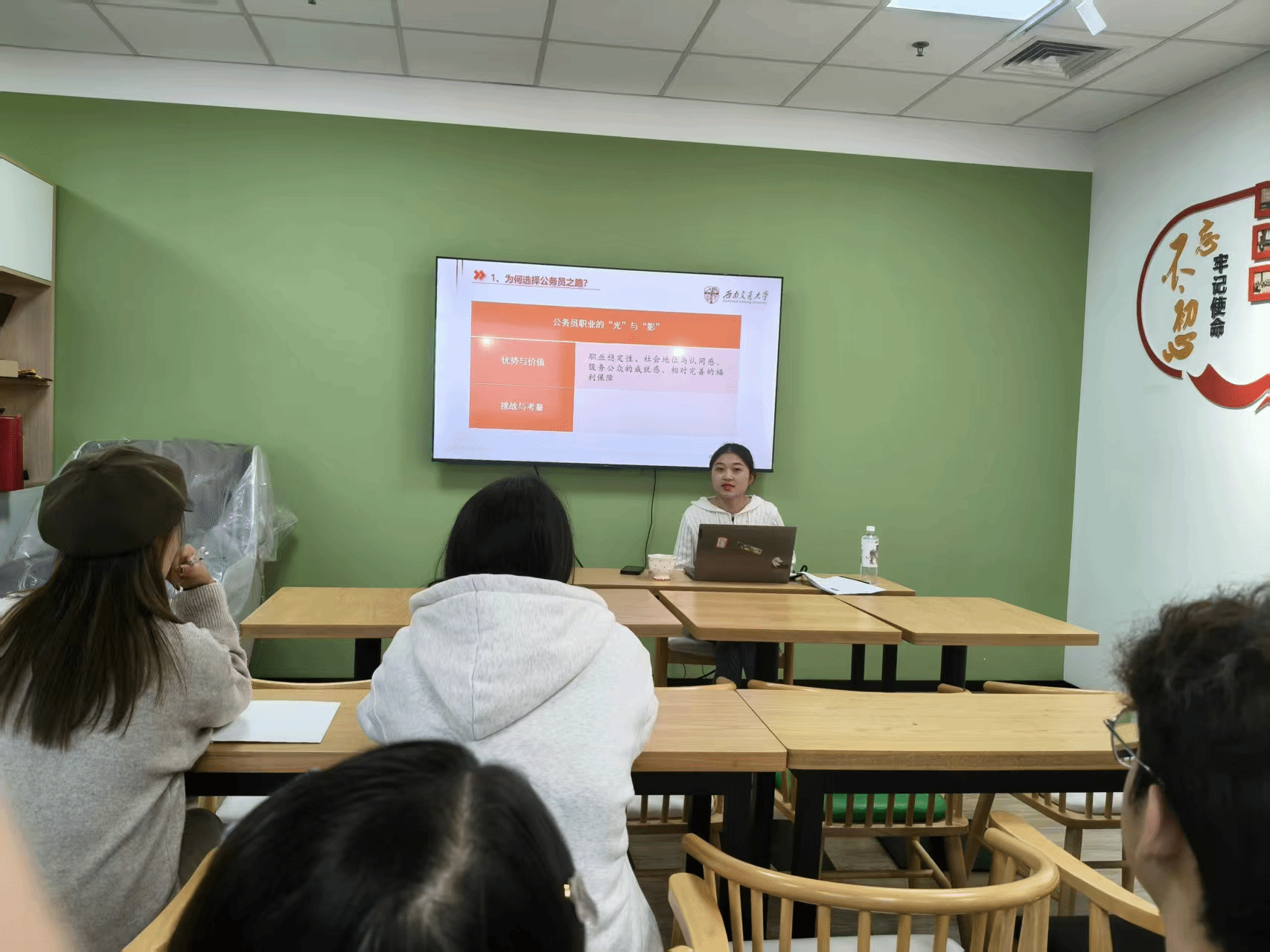 辅导内容涵盖公务员岗位全面介绍与备考全程攻略,为有意向进入公共部门就业的同学提供了系统指导。敬宇分别围绕“为何选择公务员之路”“揭开公务员面纱”“公务员需要怎样的你”以及公务员备考全攻略等模块展开讲解,详细解读了公务员招考的最新政策与形势,并结合具体案例分析了备考重点与策略,为同学们提供了实用的备考建议。在互动环节中,同学们踊跃提问,主讲老师针对个性化问题给予了细致解答。