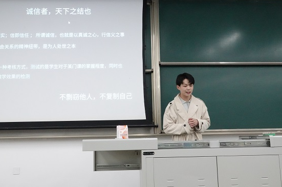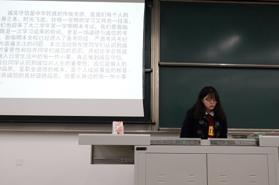 接下来是学生代表发言。18级褚奕雄同学引用朱熹的反求诸己,告诉大家作弊不仅是自欺欺人,更是对生命的浪费。诚信考试是一种自觉。17级黄佳怡同学仔细分析了考试作弊的原因以及诚信考试和注重考风建设的重要性,并列举了考试作弊案例及其后果警醒大家。16级范恺椋同学向大家解释了诚信考试的含义,他详细介绍了色情电影