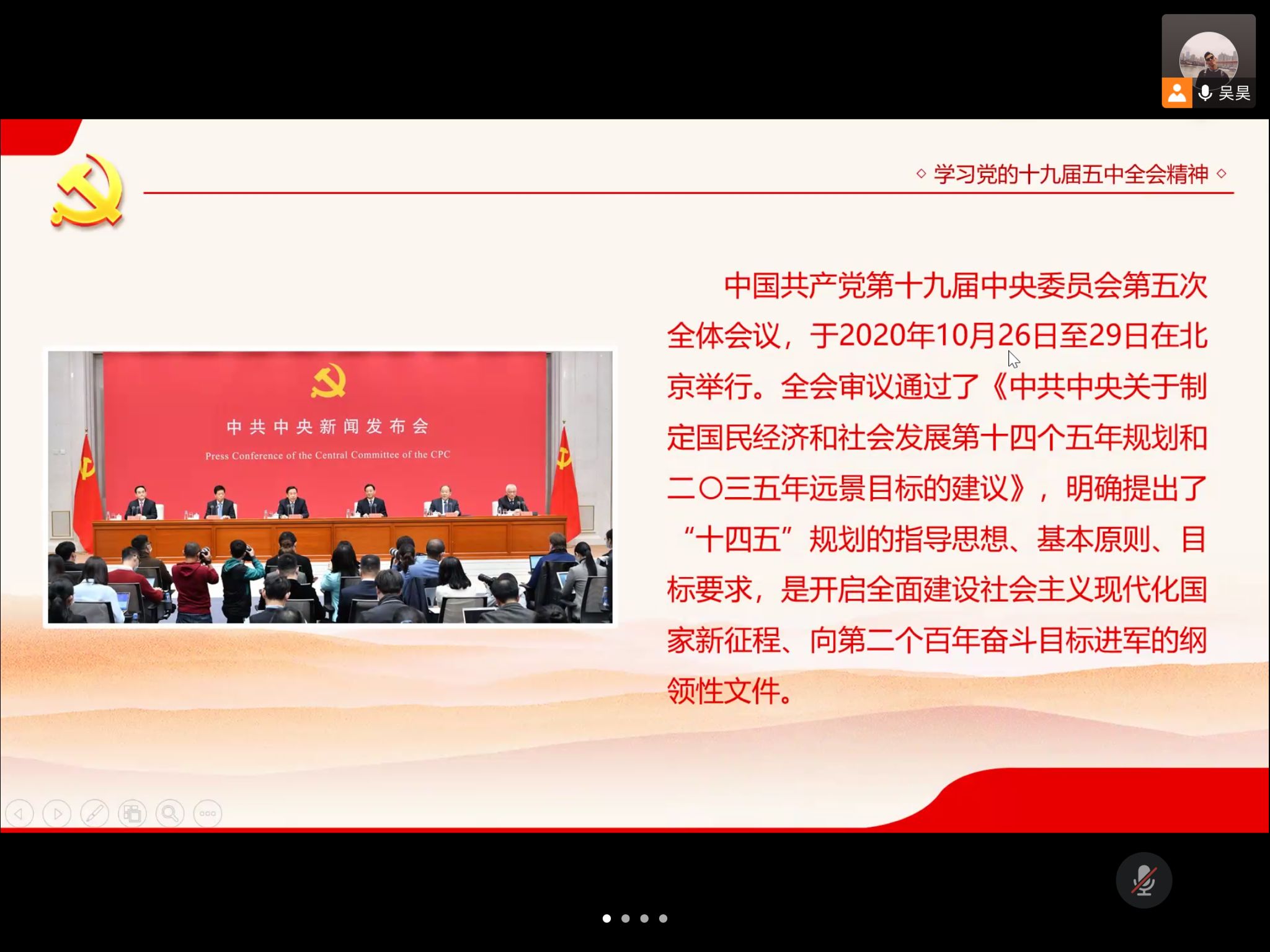 吴昊同学分别从规划《建议》起草、亮点、突出议题,双循环的新发展格局,如何实现2035远景目标五个方面深刻地介绍此次党的十九届五中全会精神,详细阐述了起草遵循的五项原则,核心要义的体现,其重要地位并介绍了部分主要议题。吴昊同学着重强调了三个值得关注的“首次”。让同学们感受到规划《建议》真正体现我们党为中国人民谋幸福为中华民族谋复兴、为中华民族谋复兴的初心使命。