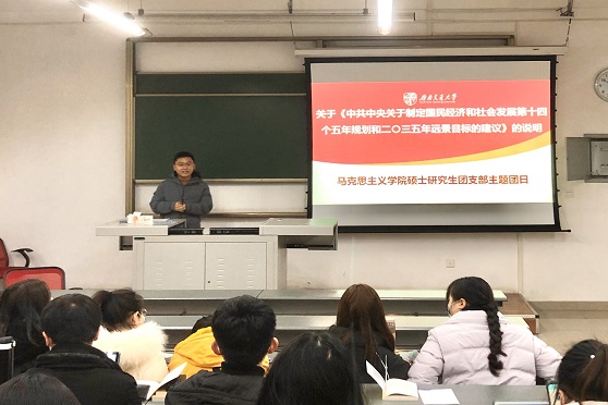 活动首先学习了习近平总书记关于《中共中央关于制定国民经济和社会发展第十四个五年规划和二〇三五年远景目标的建议》的说明。罗田分别从“建议稿起草过程、建议稿的主要考虑和基本框架、需要说明的几个重点问题”等三个方面来开展了讲解。随后,同学们观看了支部成员李浩同志录制的微党课视频,学习我国改革开放进行现代化建设以来所取得的巨大进展和历史成绩。