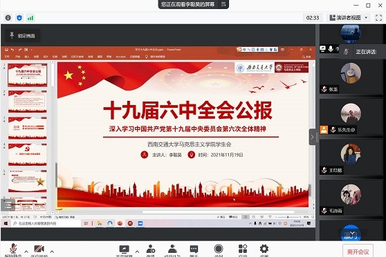 20211119日晚8时,为深刻学习贯彻党的十九届六中全会精神,我院学生会以线上方式召开了“与信仰对话”——学习贯彻党的十九届六中全会精神专题学习会,会议由主席团成员李聪昊主持,学生会全体成员共同参加。