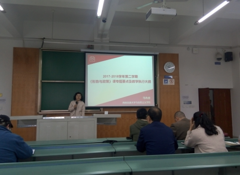 何薇副教授介绍了本学期形势与政策课基本情况,教研室成员在总结上学期教学大纲和课程安排经验的基础上,继续合理安排授课专题,尤其是紧跟时事热点,第一讲课安排了两会专题,把中央的精神和政策第一时间传达给学生,在全国的形势与政策教学中具有引领和示范作用。