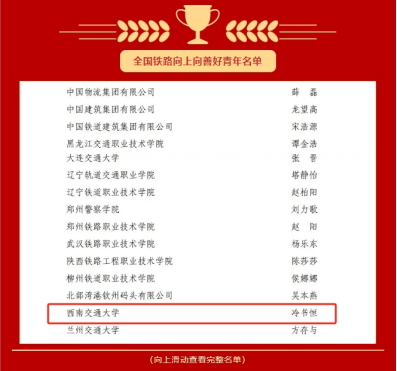 2021级博士生冷书恒荣获“全国铁路向上向善好青年”荣誉称号。