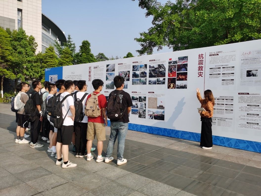 的5名研究生担任了讲解员,他们提前由汶川纪念馆的优秀讲解员负责培训讲解。在师生的共同努力下,展程中3000余名纲要课程的学生有序参观,还有其他课程的学生也闻讯赶来,共同聆听和了解汶川大地震抗震救灾的过程及其伟大精神。