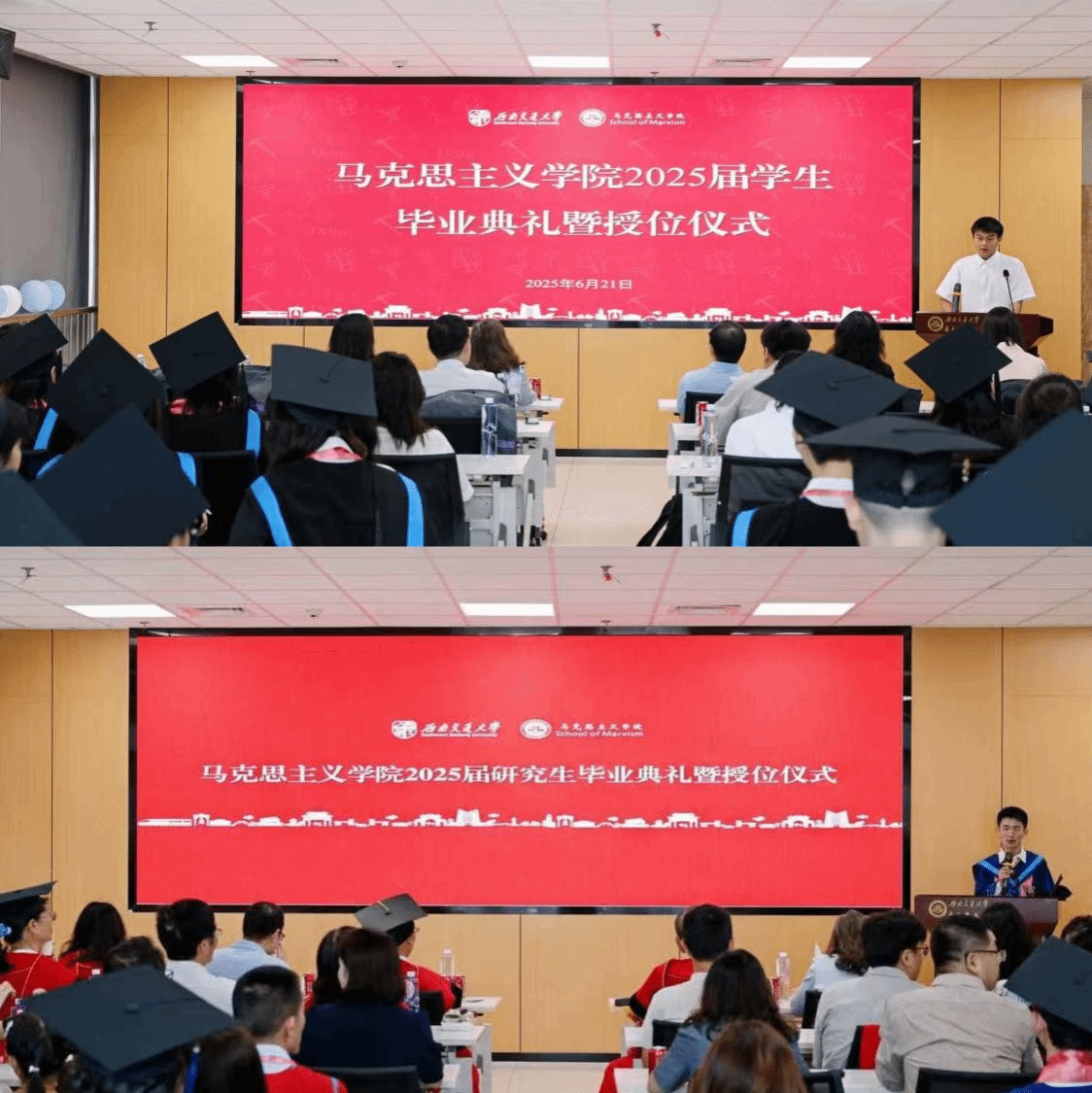 毕业典礼不仅是对2025届毕业生求学生涯的总结,更是一场镌刻着“马院人”使命与担当的启程仪式。愿全体马院学子秉承“竢实扬华”精神,在祖国各地绽放青春光彩,在实现中国梦的伟大实践中书写青春华章。