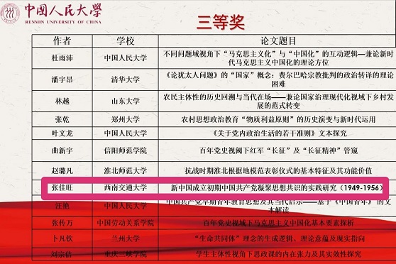 近日,我院思想政治教育专业2018级本科生张佳旺同学获得由教育部高等学校马克思主义理论类专业教学指导委员会主办、中国人民大学承办的第三届“五四杯”全国高校马克思主义理论类本科生学术论文竞赛三等奖,受邀于5月9日参加了中国人民大学举办的优秀论文交流会并做发言报告。