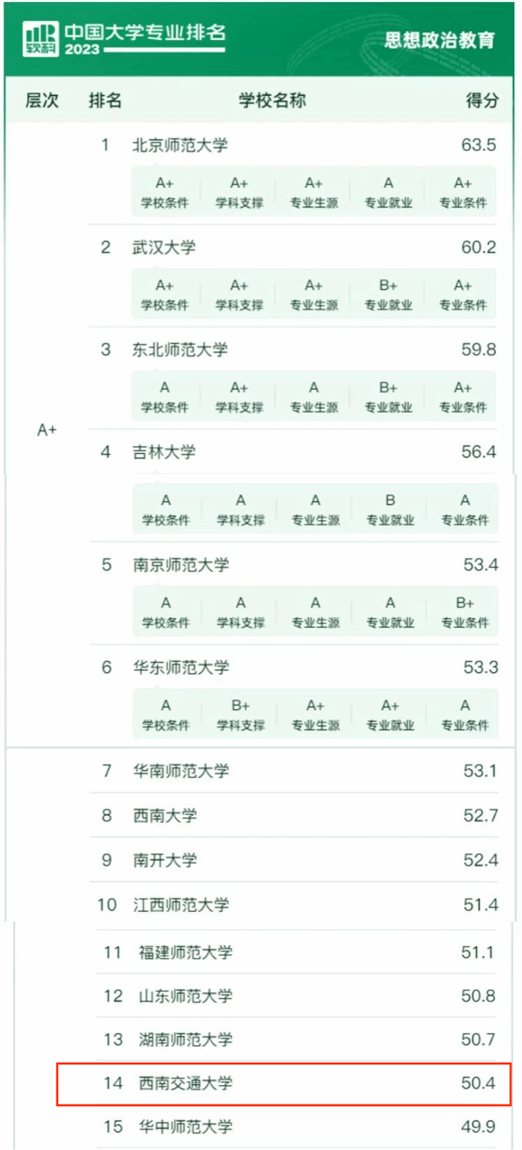 The Ideological and Political Education major takes the construction of a national first-class undergraduate major as its knob, and aims to educate talents for the country and the Party. Faculty members devoted great efforts to cultivate talents with love and genuineness, being committed to developing students into composite talents for ideological and political work with firm belief in Marxism, solid theoretical accomplishment, and outstanding practical capabilities. This ranking reflects the society’s recognition and support for the development of the Ideological and Political Education major of Southwest Jiaotong University, and also puts forward higher requirements for the major. In the future, the Ideological and Political Education major will take this recognition as an opportunity to uphold the University’s spirit of “Making unremitting efforts to cultivate talents and revitalize China”, improve the overall level of major construction, adhere to a first-class standard, and pursue glorious breakthroughs in major construction.