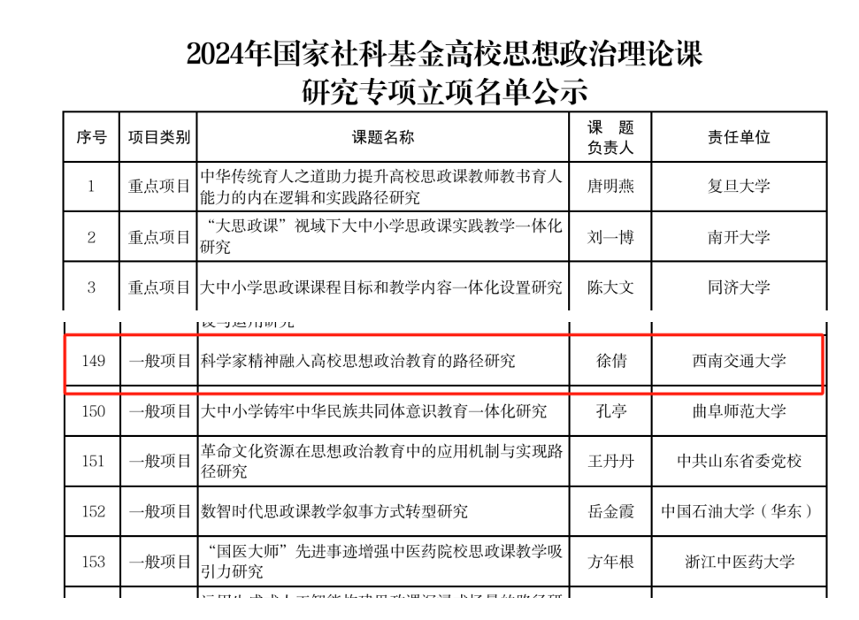 2024年12月12日,我中心研究员、色情电影 讲师徐倩,获2024年国家社会科学基金高校思想政治理论课研究专项一般项目立项公示。此次立项的课题名称为“科学家精神融入高校思想政治教育的路径研究”。该课题旨在深入探究科学家精神景观文化空间的构建与精神传导机制及其育人功能的效果评价和优化路径,结合文化社会学与思政教育理论,通过社会调研与理论分析,探索科学家精神多维度深度融入高校思想政治教育体系的优化路径。