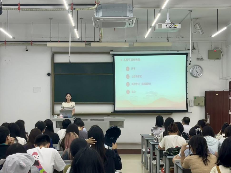 历届本研学生的就业去向,通过列举具体数据和真实案例,从行业分布、地域选择、岗位类型等多个维度进行分析,让在场学生清晰了解历届毕业生的职业选择与发展情况。赵子涵表示,希望通过分享这些经验,为同学们提供参考,助力大家结合自身情况规划职业路径。