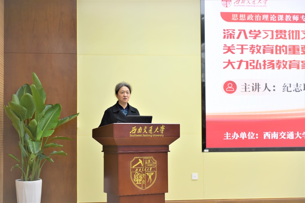 在专题报告环节,纪志耿以“深入学习贯彻习近平总书记关于教育的重要论述 大力弘扬教育家精神”为题,系统阐释了习近平总书记关于教育的重要论述的时代背景、核心内涵、鲜明特质及实践路径。他结合“钱学森之问”和“中国教育是能够培养出大师”的时代之答的案例作为切入点,深刻解读了教育家精神的六种特质,呼吁思政课教师将教育家精神转化为思想自觉和行动自觉,厚植家国情怀,因材施教,做学生成长的引路人。纪教授的讲座旁征博引、深入浅出,既有扎实的理论功底,又紧密联系时代与教学实践,语言生动、感染力强,赢得了在场教师的热烈掌声。